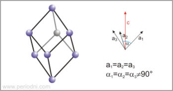 Ce système peut être décrit de deux façons. Soit on décrit la maille élémentaire comme un rhomboèdre formé par six losanges égaux, donc a=b=c et a=b=g!=90°, soit on le décrit comme le système hexagonal (a = b != c, et a = b = 90°, g = 120°). Cette seconde façon est maintenant préférée pour la présentation des paramètres cristallographique des minéraux. L'élément caractéristique du système est un axe de symétrie d'ordre 3 : A3. Il comporte 7 classes de symétrie.