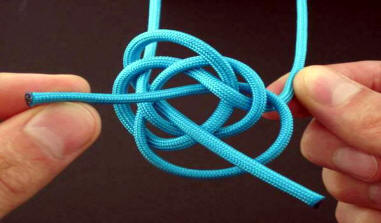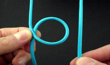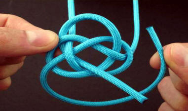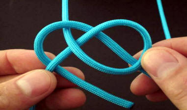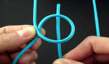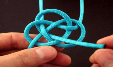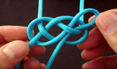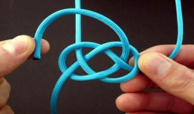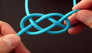 5. Tirez la boucle vers l'extérieur pour former un coude Carrick. | 6. Maintenant, accrochez l'extrémité droite vers la gauche, sur le cordon (gauche) au-dessus du Carrick Bend... |