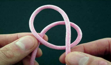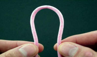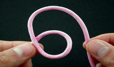 1. À huit pouces à droite de l'extrémité gauche du cordon, faites une boucle. | 2. Faites ensuite un P dans le sens des aiguilles d'une montre avec le cordon de gauche (descendant). |