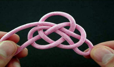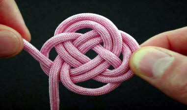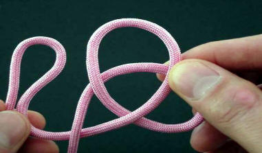 7. Maintenant, tirez l'extrémité droite sur la boucle inférieure gauche du nœud Double Coin... | 8. ...et parallèlement au creux de l'extrémité gauche debout. |