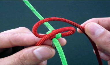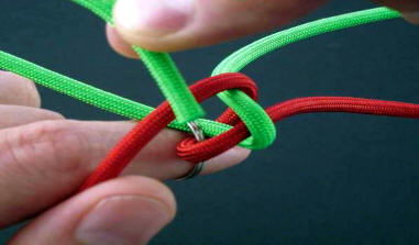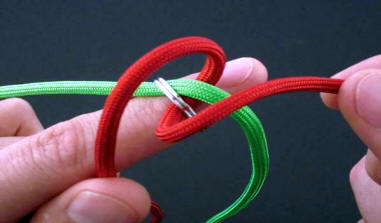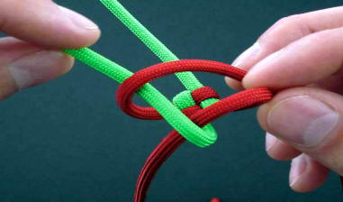 5. Tissez l'autre extrémité du cordon droit sur son premier arc... | 6. ...et à travers le creux de la deuxième arche. Serrez pour former un nœud de couronne. |