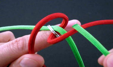 1. Enfilez les deux cordons dans un anneau fendu jusqu'à atteindre leur milieu. | 2. Pliez l'un des cordons en arc de cercle sur l'autre, deux fois, dans des directions opposées. |