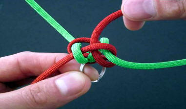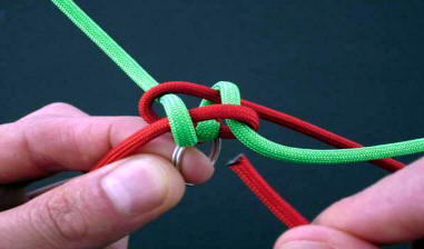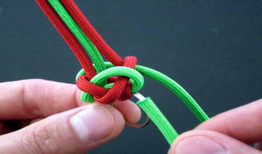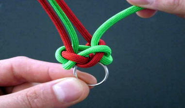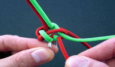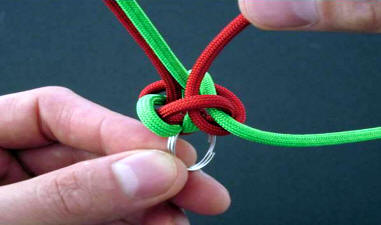 17. ...insérez-le à travers le centre du nœud de la couronne. | 18. Ajustez les cordons jusqu'à ce que le nœud en diamant à 4 brins soit ferme et symétrique. |