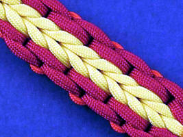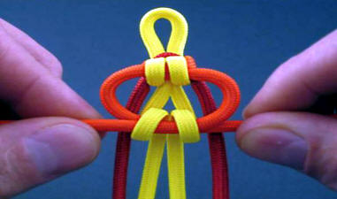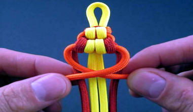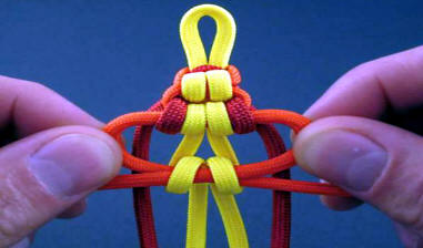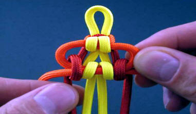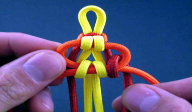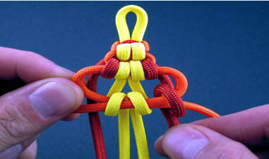 15. Entourez les extrémités droite et gauche du troisième cordon autour des cordons croisés,... | 16. ...à l'intérieur d'eux-mêmes et à l'extérieur des cordons verticaux intérieurs. |