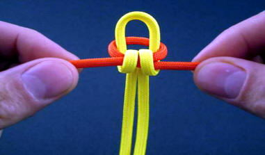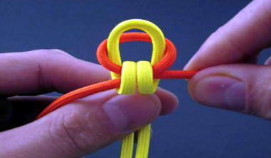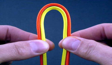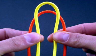 1. Commencez par des boucles créées au milieu de deux cordons. | 2. Laissez tomber l'un des cordons de 0,5 pouce, derrière la boucle de l'autre. |