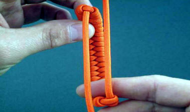 13. Retournez la pièce horizontalement et répétez les étapes 10 à 12. | 14. Pour terminer le bracelet, coupez et brûlez soigneusement les extrémités du nœud. |