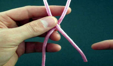 1. À cinq pouces à gauche de l'extrémité droite du cordon, soulevez une boucle dans le sens inverse des aiguilles d'une montre sur la longueur de la sangle souhaitée. | 2. Maintenez l'extrémité debout (extrémité courte du cordon) sur la droite. |