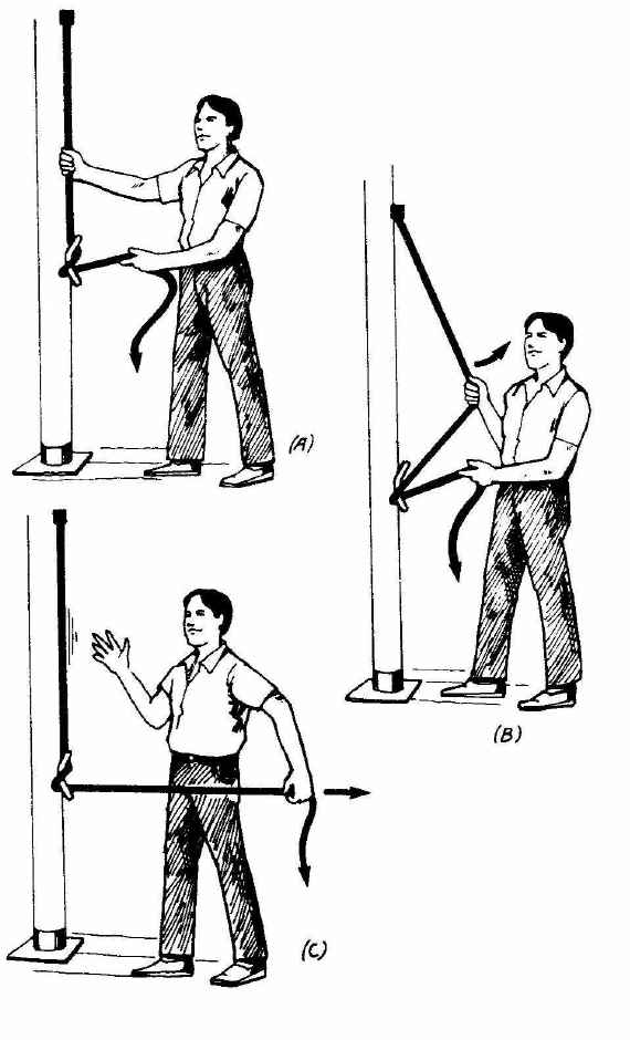 Il ne faut pas laisser la corde sortir de son taquet; laissez au moins un demi-tour (fig. A) dans son support. Ensuite, tenez fermement ce demi-tour d'une main et de l'autre main agrippez le mou et tirez comme sur la corde d'un arc (fig. B). Relâchez et au même moment tirez avec l'autre main (fig. C). Vous pouvez ainsi récupérer quelques centimètres grâce à la friction du demi-tour si vous répétez le processus plusieurs fois.