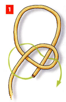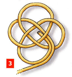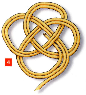 Pour obtenir un assemblage plat, effectuez un nœud de carrick modifié (pages précédentes), c'est-à-dire dont les deux bouts émergent du même côté {Figures 1-2). Faites ensuite glisser le courant le long du dormant (Figure 3). Le nœud ainsi obtenu possède deux caractéristiques - trois brins entrelacés (les torons) et quatre parties festonnées (les ganses) - qui le distinguent de tous les autres bonnets turcs. Sa dénomination abrégée est 3 T x 4 G. Suivez le brin original, en effectuant les mêmes croisements par-dessus et par-dessous, jusqu'à ce que le nœud ait été doublé (Figure 4) ou triplé.