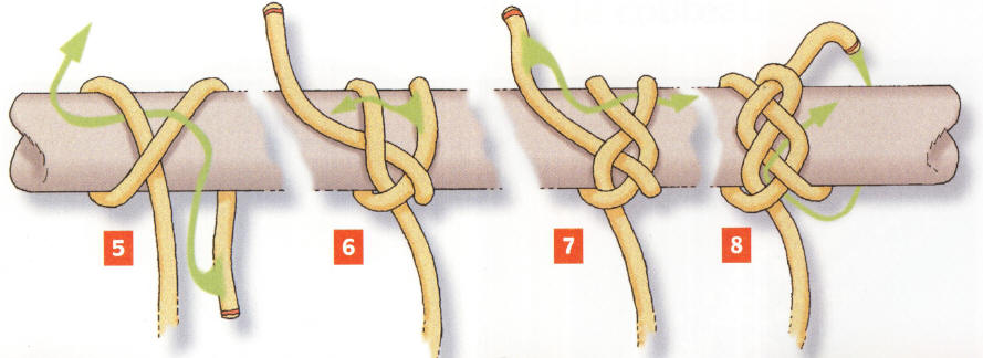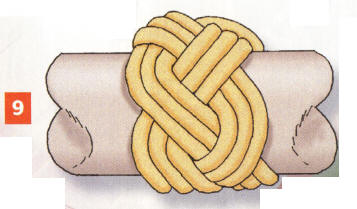 Même si le bonnet turc 3 T x 4 G illustré ici peut être par la suite resserré autour d'un doigt ou d'un objet et faire ainsi office de bague ou de bracelet tressé, il vaut mieux le nouer directement sur son support. Enroulez, tournez et entrelacez le courant tel qu'indiqué (Figures 5-8). Doublez ou triplez le cordage pour terminer le nœud (Figure 9). On peut accentuer l'aspect décoratif d'un nœud à trois brins en insérant un second cordage de couleur différente. Serrez le nœud patiemment, petit à petit, en tirant tour à tour sur chacun des brins du cordage.