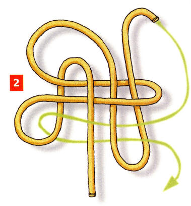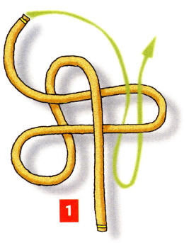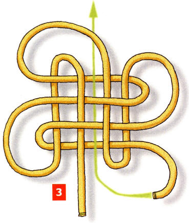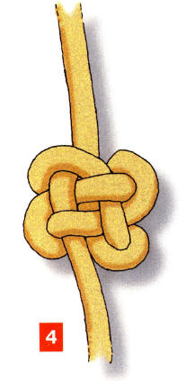 II est souvent recommandé d'utiliser une planche et des aiguilles pour immobiliser les divers brins du nœud aux premiers stades de sa réalisation, avant qu'il ne soit définitivement verrouillé. Mais avec une bonne concentration (et un bon esprit d'observation), on peut le nouer assez facilement avec ses deux mains sans l'aide d'un support. Le nœud est formé de quatre ganses entrelacées {Figures 1-3), qui sont par la suite resserrées afin de constituer un nœud en quatre parties assorti de quatre coins festonnés (Figure 4). Les deux côtés sont identiques.