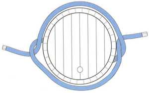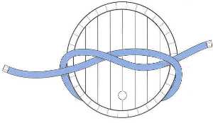 On commence par glisser une longueur de corde sous le fût, avant de rabattre les deux extrémités sur le dessus du fût, on l'on réalisera un noeud simple. Le schéma représente le fût vu du dessus. |