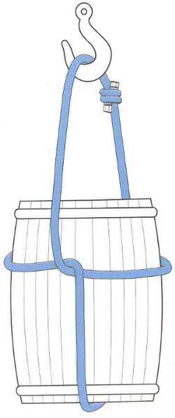 Il suffit pour terminer de relier les deux extrémités, par exemple par un noeud de pêcheur. Celui-ci devra être réalisé sur le côté, de façon à ne pas être écrasé par le crochet où l'on pendra la barrique, par exemple à l'aide d'un noeud de gueule-de-raie.
