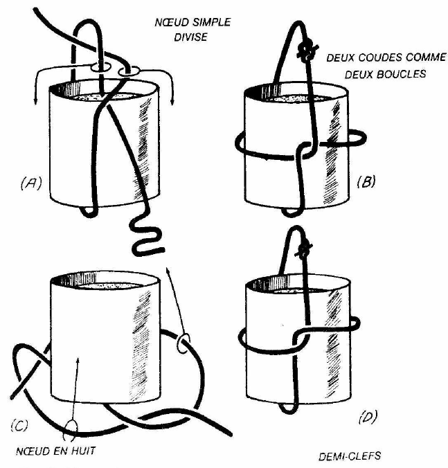 Si vous soulevez et déposez la charge plusieurs fois, il est préférable d'utiliser un nœud en huit (fig. 40C), des demi-clés sont ainsi formées (fig. 40D). Au premier coup d'oeil cela a l'air identique, mais c'est différent. Les parties supérieures sortent d'en dessous des coudes mais ont tendance à rester contre la charge même quand il n'y a plus de tension; cela laisse l'élingue en place pour un autre emploi.