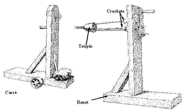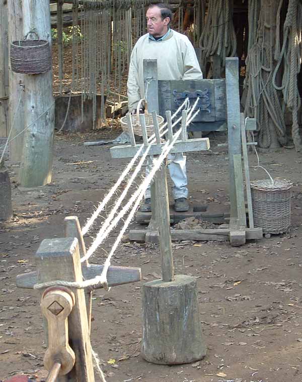 Une personne tournait alors les crochets du rouet à l’aide d’un système très simple mais qui permettait à tous les crochets de tourner à la même vitesse. Le rouet était fixe et le tourneur se tenait sur le pied du rouet pour l’immobiliser. A l’autre extrémité une autre personne avait glissé entre les fils un toupin, pièce de bois avec des encoches qui évitait que les fils ne s’emmêlent. Cette personne maintenait le toupin près du carré tandis que son collègue tordait les cordes. Lorsque l’on faisait de longues cordes on posait en outre un chevalet entre le rouet et le carré. Le chevalet était un « T » qui portait une rangée de dents en bois, pointées vers le haut. Le chevalet aidait lui aussi à maintenir les fils séparés. Le carré, muni de roues, avançait doucement au fur et à mesure que les fils se torsadaient.
