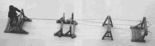 il est nécessaire que le bloc avec les trois axes soit fixe sur la planche tandis que le bloc avec le plateau soit monté sur roulettes et tiré en arrière par un contrepoids dont la course représente au minimum 20% de la longueur des brins, |