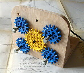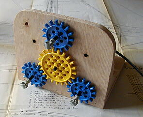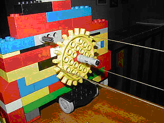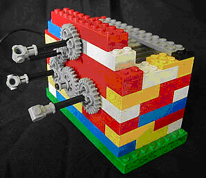 Vue antérieure du bâti fixe pour commettage à trois torons. Ce système d’engrenage ne se trouve plus à ma connaissance dans le commerce, mais le système Lego Technic actuel comporte des pignons plus petits qui peuvent tout à fait convenir. |