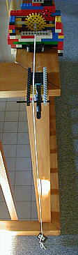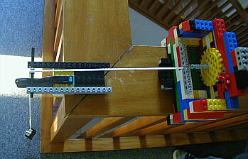 Le bâti mobile se déplace sur la planche qui sert de chemin de roulement grâce à de petites roues en Lego dont l’axe emprunte là encore un tube laiton, ça roule tout seul ! Pour le fonctionnement, c’est identique au système tout Lego en moins bruyant. |