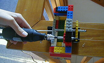 Exemple : si ma planche fait un peu plus de 5 mètres les 3 brins font 5 mètres, lorsque je les tord sur eux même il raccourcissent de 20% soit un mètre, le bloc-plateau doit donc pouvoir avancer d’un mètre et le contrepoids monter d’un mètre aussi. Sur la photo on voit que j’utilise une mini perceuse pour faire fonctionner la machine. Cela va plus vite mais attention, si on va trop vite, ça chauffe et les Legos fondent, il faut donc trouver le juste milieu et il est conseillé de graisser les axes des pignons. Ne pas oublier de bloquer le plateau du bloc plateau sinon il va se mettre à tourner tout seul avant que les torons soient suffisamment tournés. |
