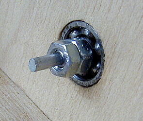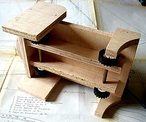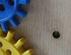 Les axes des pignons passent dans de petits morceaux de tube laiton de 6mm de diamètre extérieur et 5mm intérieur, enfoncés en forçant un peu dans le bois et bien graissés. |