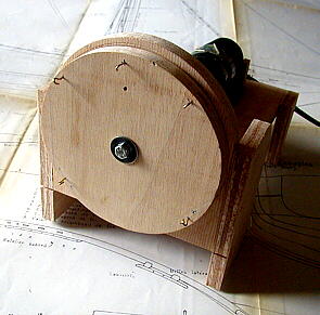 Vue arrière avec le moteur, ici une mini perceuse Maxicraft qui entraîne la roue dentée centrale. I