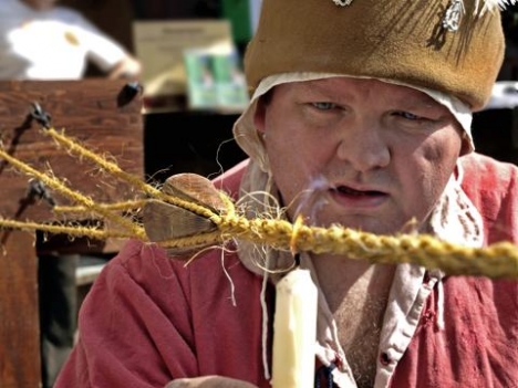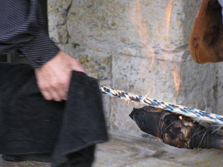 Enfin, à l'aide d'une torche, on brûle la corde, probablement pour la souder. Une personne passe derrière pour éteindre le feu à l'aide d'un chiffon humide.