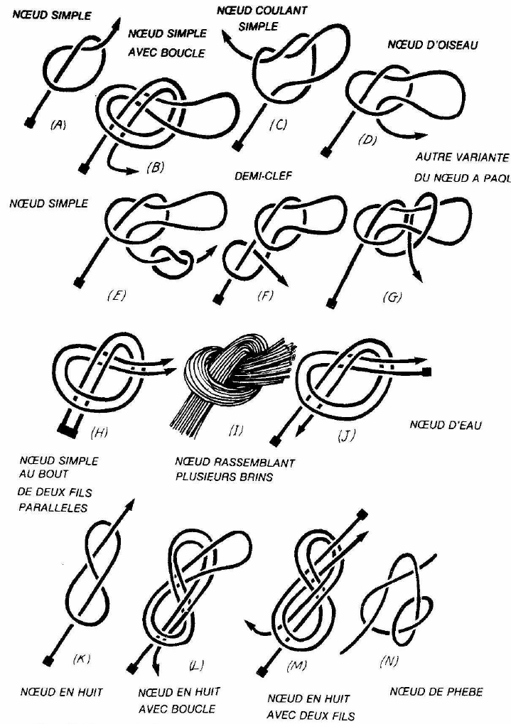 Le nœud simple (fig. A) sera utilisé à la place d'une surliure pour empêcher le fil de passer à travers une étoffe. Un nœud simple avec boucle (fig. B) est un bon moyen d'attacher un anneau ou un crochet. Le nœud coulant simple (fig. C) est le point de départ pour ficeler des paquets.