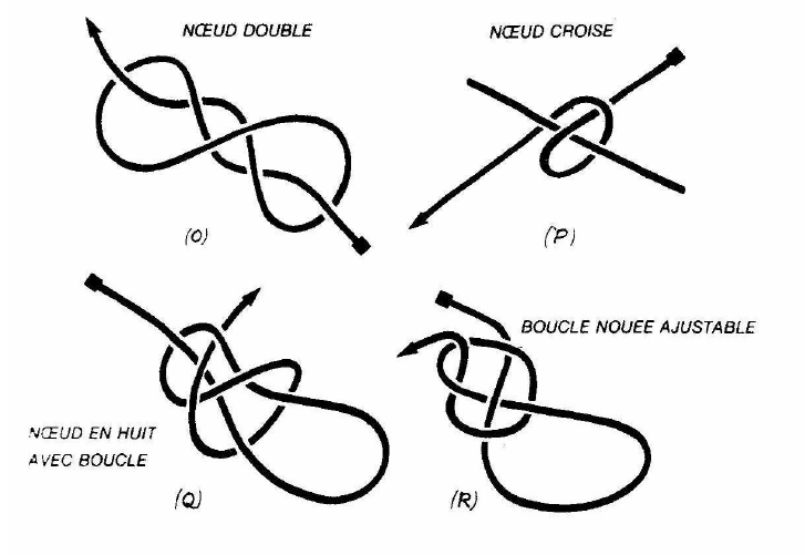 La fig. Q montre un autre nœud en huit avec une boude. La boucle nouée ajustable (fig. R) peut comme son nom l'indique être ajustée et fermée en tirant un des brins.