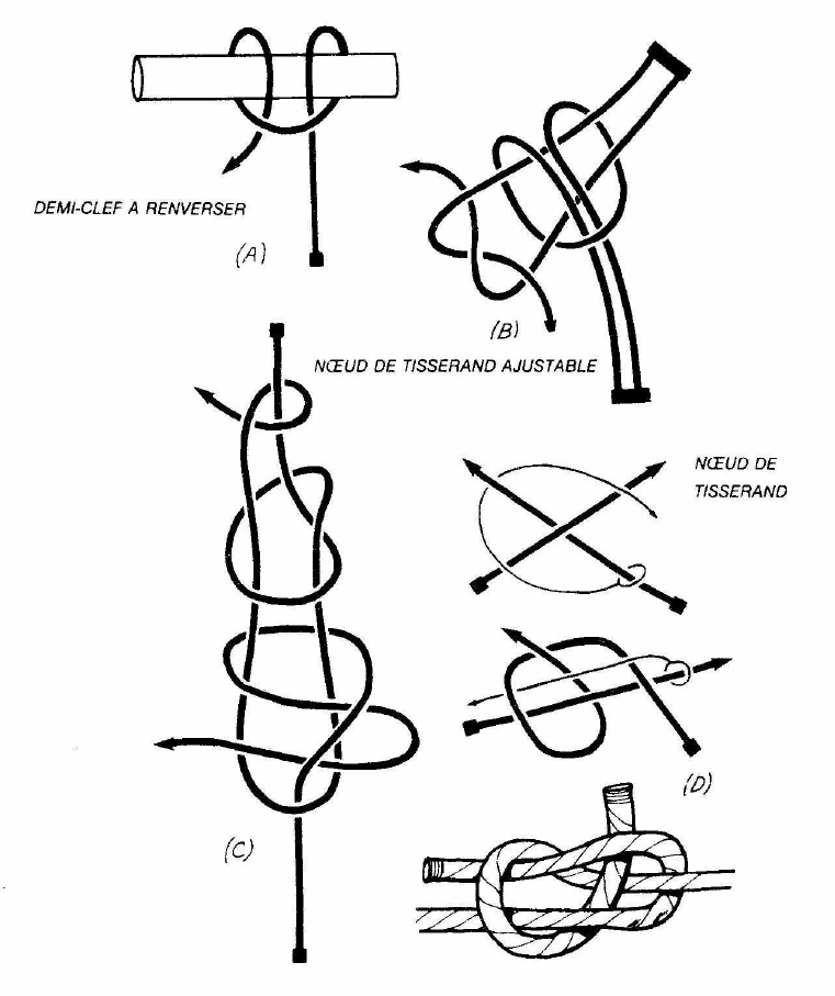 Aussi, les nœuds suivants sont utiles aux tisserands ainsi qu'à d'autres artisans: le nœud plat, le nœud simple, le nœud en huit, la demi-clef à capeler, le nœud de brigand, le nœud d'attache et le nœud à deux tours morts et deux demi-clés (fig. 12, 9A, 19K, 16, 38, 35 et 17). En voici quelques autres particuliers au tissage.