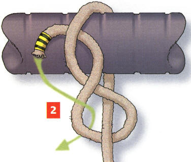 Glissez le cordage autour d'une bane, d'un piquet, d'un anneau ou d'un autre point d'amarrage et passez le courant derrière le dormant, puis ramenez-le sur le devant et enfilez-le tel qu'indiqué (Figures 1-2). Enfin, tirez afin de bien ajuster et de bien souquer ce qui constitue en fait une boucle coulissante (Figure 3).
