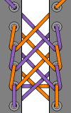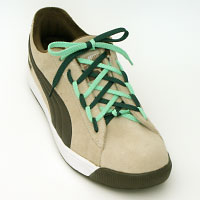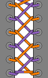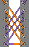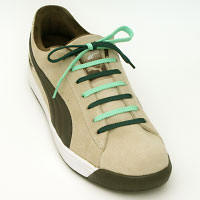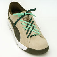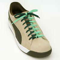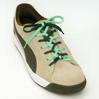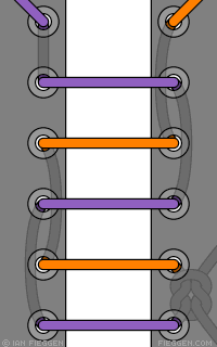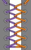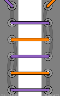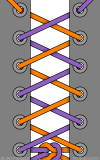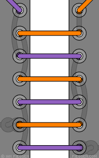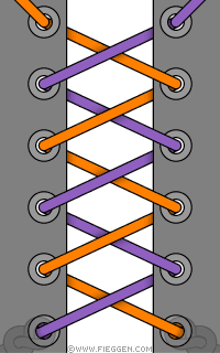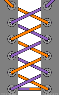 Les lacets peuvent être achetés en deux couleurs, soit moitié d’une couleur et moitié d’une autre. Une autre alternative est de teindre la moitié d’un lacet normal avec une autre couleur, ou utiliser deux moitiés de lacet de différentes couleurs. On peut utiliser ces lacets bi-couleurs pour n’importe lequel laçage.