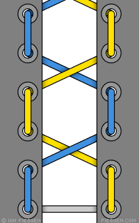 Cette version extérieure du laçage en nœud de papillon est utilisée pour les bottes de combat de différentes armées. Avec les croisements à l’intérieure les bottes peuvent fléchir plus aisément.