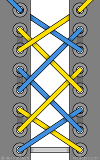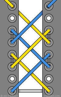 Comme le Laçage double croisement, Ce laçage commence en passant le lacet par l’extérieur dans les deux œillets du bas, on continue en passant le lacet par l’intérieur trois œillets plus haut, en suite on fait passer le lacet par l’extérieur dans l’œillet du bas et ainsi de suite. Le résultat ressemble au symbole #.