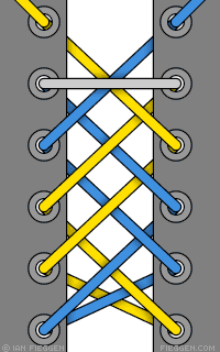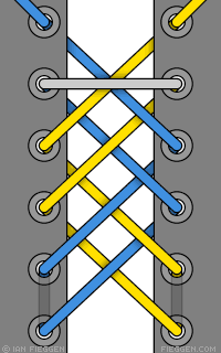 Ce laçage se tient très fermement mais il est très difficile à serrer. Le laçage commence en haut pour descendre puis remonte deux fois. Voici deux variations :
