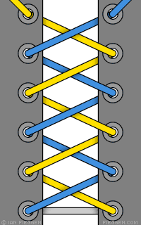 C’est probablement la méthode de laçage la plus commune pour lacer des chaussures et des bottes. On commence le laçage dans les œillets du bas de l'intérieur vers l'extérieur. Le lacet s’entrecroise jusqu’en haut de la chaussure.