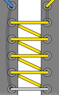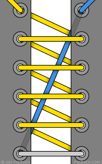 Sauvant vu dans les magasins de chaussures, car la plupart des chaussures son pré-lacer en usine. Un côté du lacet va directement en haut et l’autre va en zig-zag au travers des œillets. Voici deux variations :