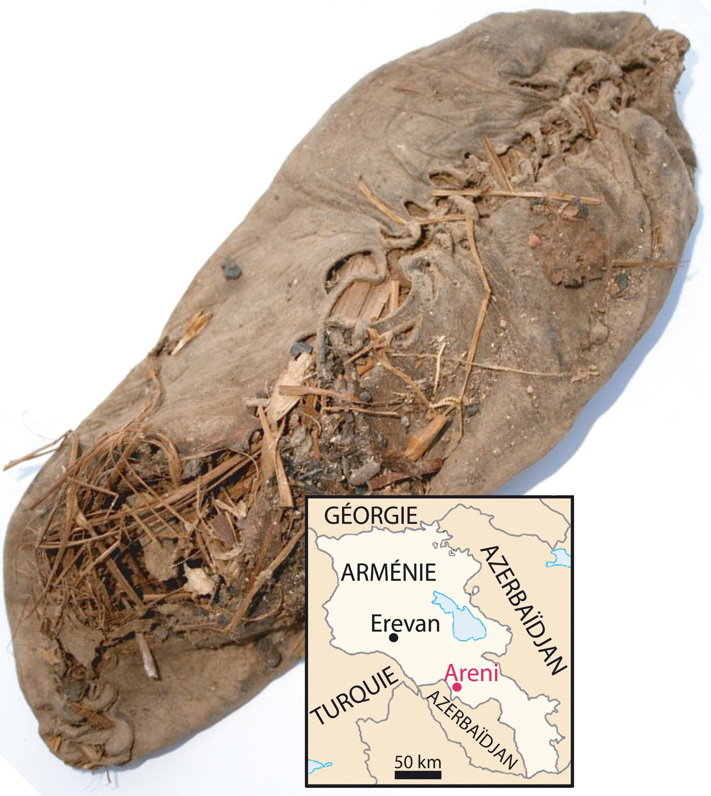 Le mocassin de cuir trouvé dans la grotte arménienne d'Areni-1 (voir carte ci-dessus) est fait d'une peau de vache percée de trous sur ses bords, puis tendue autour d'un pied grâce à un lacet de cuir.