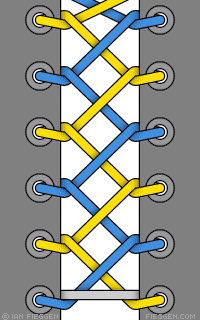 Les lacets sont barrés à chaque pair d’œillet. Idéal pour lacer très serré des patins de skate, car les sections précédente reste très serrées longtemps. Le laçage ressemble à un gros zip (zipper).