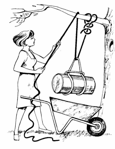 Un palan double pratiquement la force de traction: on peut donc, même si l'on n'est pas très fort, soulever des charges assez lourdes. Utilisez une corde solide et ne restez pas sous la charge. Renforcez le support si nécessaire. Pour soulever une charge d'un mètre, il faut tirer deux mètres de corde.