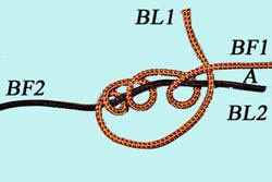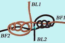 Mettre les deux nylons l'un à côté de l'autre en sens opposé, avec le Brin Libre 1 faire 4 enroulements autour du Brin Fixe 2, puis faire passer, de bas en haut, BL1 en A.