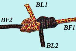 Lubrifier et tirer doucement sur les deux Brins Fixes. Couper les deux BL près du noeud (laisser 1mm) pour faciliter le passage dans les anneaux. Si l'on veut conserver une potence, ne couper qu'un des BL. |