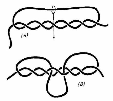 Une des façons les plus sûres et les plus solides de confectionner un pater noster consiste à faire un nœud triple (fig. 59A) et d'y passer une ganse (fig. 59B). Un pater noster est un montage spécial d'un bas de ligne qui comprend plusieurs hameçons étages.