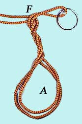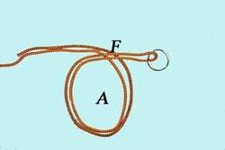 Faire passer l'anneau dans la boucle A, lubrifier, lâcher F et tirer doucement sur l'anneau et sur les 2 brins pour serrer le nœud. |