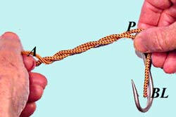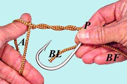 Réduire la tension entre A et P, écarter la boucle A, y introduire le pouce gauche et saisir ensemble l'hameçon et le Brin Libre, |