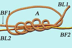 Mettre les 2 brins côte à côte et faire la boucle A avec le brin libre du 1er morceau. |