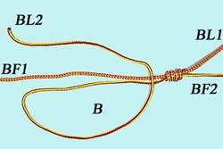 Nœud excellent pour faire des bas de lignes, chaque nœud est serré indépendamment et glisse sur le brin fixe de l'autre morceau. Mettre les 2 brins côte à côte et faire la boucle A avec le brin libre du 1er morceau.