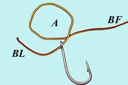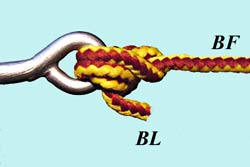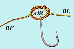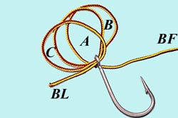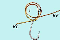 Pour serrer le nœud: bloquer l'hameçon en l'accrochant, lubrifier et tirer doucement sur BL et BF pour refermer les boucles. |