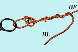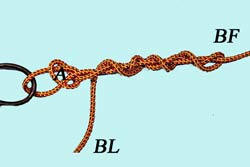 Passer le Brin Libre dans le nœud simple A, bien lubrifier, puis tirer sur BL, BF et l'hameçon pour serrer le nœud. |
