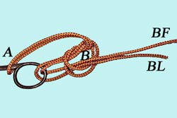 Doubler le fil sur 15 à 20 cm et passer la boucle A dans l'œillet. Avec la boucle A, faire un nœud simple B autour de la partie fixe. |