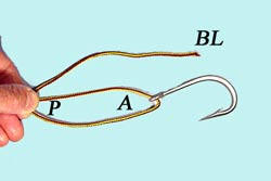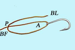 Passer 15cm de fil dans l'oeillet, ramener le brin libre BL à l'hameçon |